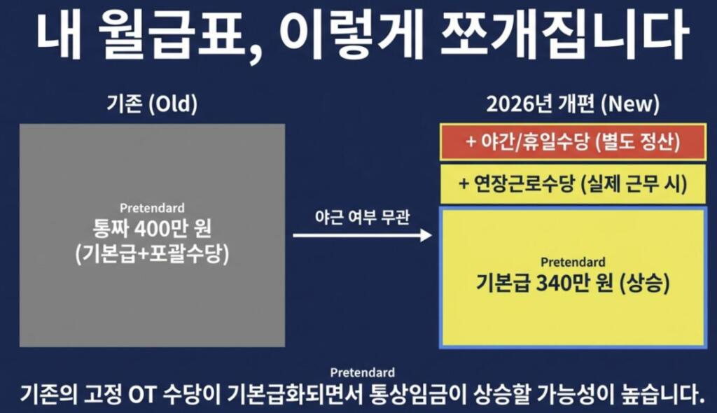 같은 연봉 4,200만 원이라도 앞으로는 월 350만 원을 그냥 고정 지급하는 구조보다, 기본급과 고정OT를 명확히 나누고 실제 연장근로가 약정시간을 넘으면 추가 수당을 별도로 정산하는 방식이 더 중요해질 가능성이 큽니다.