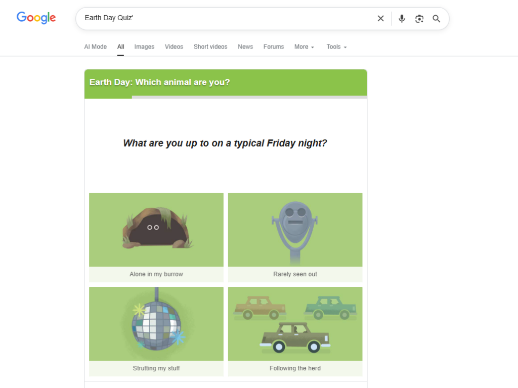 ‘구글 숨겨진 미니게임’ 등의 키워드로 자주 검색되는 것처럼, 다양한 재미 요소를 숨겨놓는 Google은 지구의 날에는 사용자들에게 퀴즈를 제공합니다. 실제로는 퀴즈라기보다는 심리 테스트와 같은 것으로, 여러 간단한 질문에 답하면 마지막에 자신이 어떤 동물과 닮았는지 비유해 주는 방식입니다.