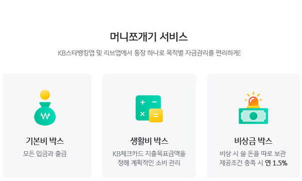 KB국민은행의 ‘KB 마이핏 통장’은 일반 입출금 계좌를 넘어 하나의 통장을 여러 박스로 나눠 관리할 수 있는 ‘머니쪼개기’ 기능을 제공합니다.