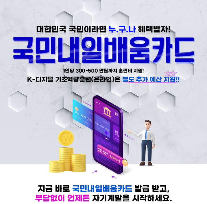 국민내일배움카드는 실업자, 재직자, 특수형태근로종사자, 자영업자 등 취업 여부나 직종에 관계없이 직업 훈련이 필요한 국민이라면 누구나 신청할 수 있는 국가 지원 제도인데요.